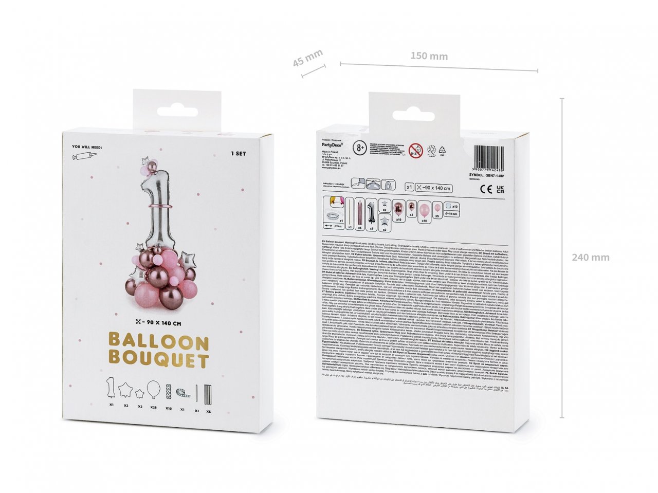 Balónková kytice Číslo ''1'' v růžové barvě, sada obsahuje: balónky (28 ks), balonkovou girlandu (10 ks), modelovací balónky (5 ks), papírové brčko (1 ks), fóliové balónky (5 ks) a 2,5 ks m balónkové girlandové pásky. Velikost cca. Rozměr 90 x 140 cm.