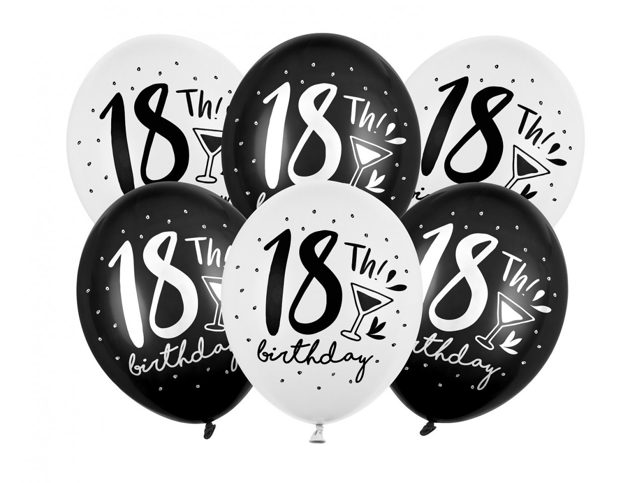 Silné balóny 18.! narozeniny, bílo-černý pětistranný potisk, mix barev (Pure White a Black), průměr 30 cm, 6ks