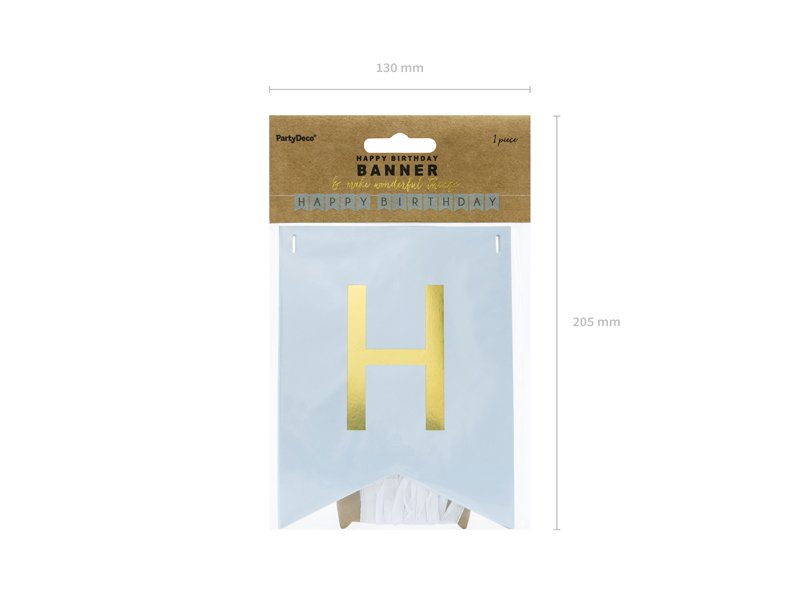 Světle modrý banner se zlatým nápisem Happy Birthday, pro svépomocné složení, sada obsahuje písmena a cca 2,5 m bílé stuhy, rozměry po složení: výška cca 15 cm, délka cca 175 cm.