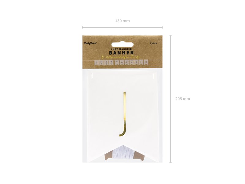 Banner, bílý se zlatým nápisem Just Married, udělej si sám, sada obsahuje písmena a cca. 2,5 m bílé stuhy, rozměry po sestavení: výška cca. 15 cm, délka cca. 155 cm.