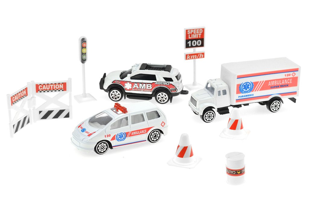Máte doma malého policistu? Pak ho jistě potěší tento hrací set, kde nalezne záchranářské auto, záchranářské SUV, záchranářský náklaďák, značky i různé druhy ukazatelů a zábran.
