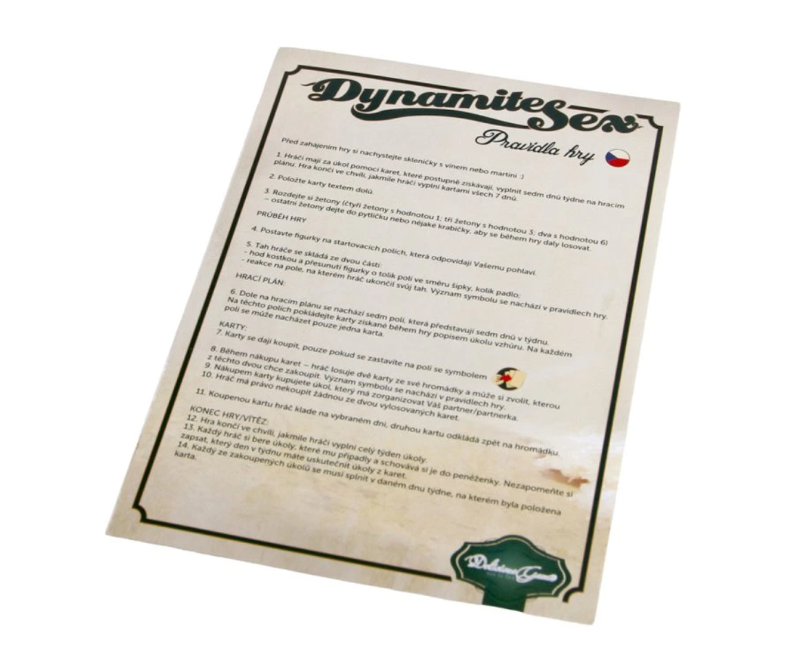 Dynamite sex je erotická hra pro páry. S touto hrou si můžete rozšířit své možnosti v ložnici i mimo ni. Hra obsahuje různé úkoly, které můžete plnit ihned nebo si je můžete naplánovat na pozdější chvíli či jiný den.