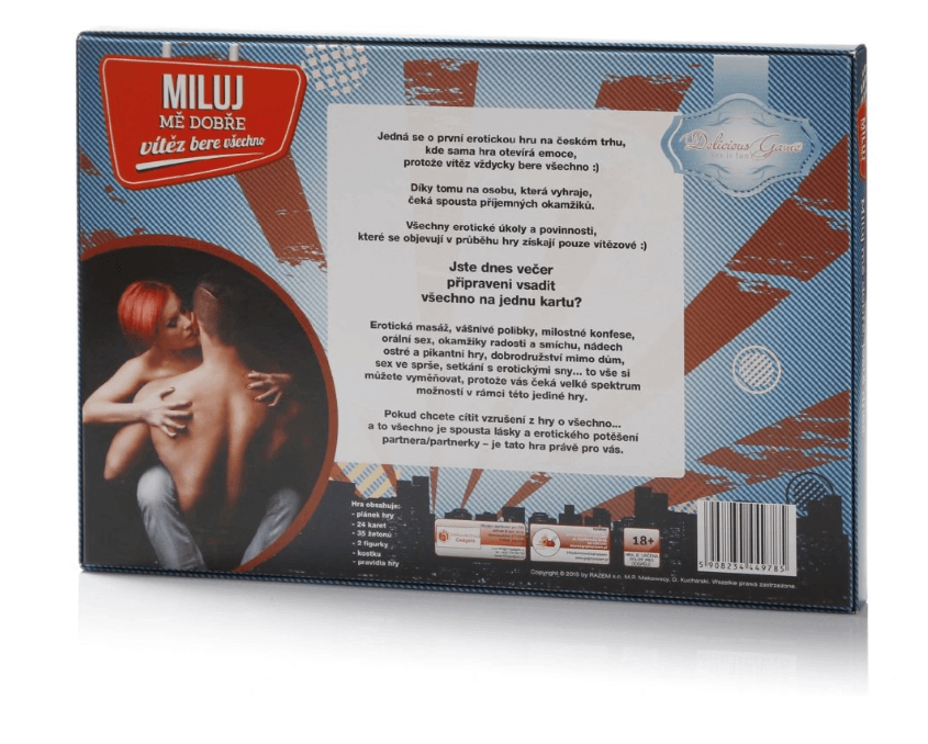 Udělejte si se svou drahou polovičkou nezapomenutelný večer a zahrajte si erotickou deskovou hru Miluj mě dobře. Hra obsahuje hrací desku, kartičky, kostku a jediné co Vám bude stačit je Vaše erotická fantazie. Díky této hře můžete se svou láskou oslavit Valentýn nebo výročí a připravit si tak jedinečný sexuální večer plný vášně. Okořeňte si milostný život s touto erotickou hrou a vyzkoušejte, co vše Vám hra nabízí. Erotická hra Miluj mě dobře je originální dárek pro zamilované.