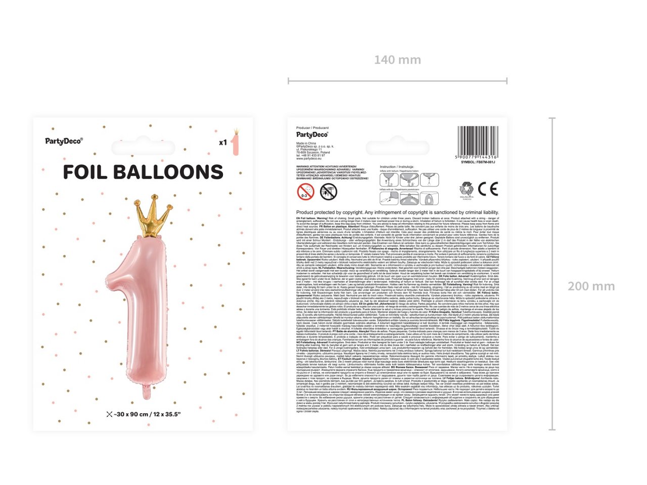 Metalický fóliový balónek číslo 1 ve světle růžové barvě s korunkou ve zlaté barvě, velikost před nafouknutím cca. 37 x 100 cm (15 x 39''), velikost po nafouknutí cca. 30 x 92 cm (12 x 36''). Nafoukněte vzduchem a heliem