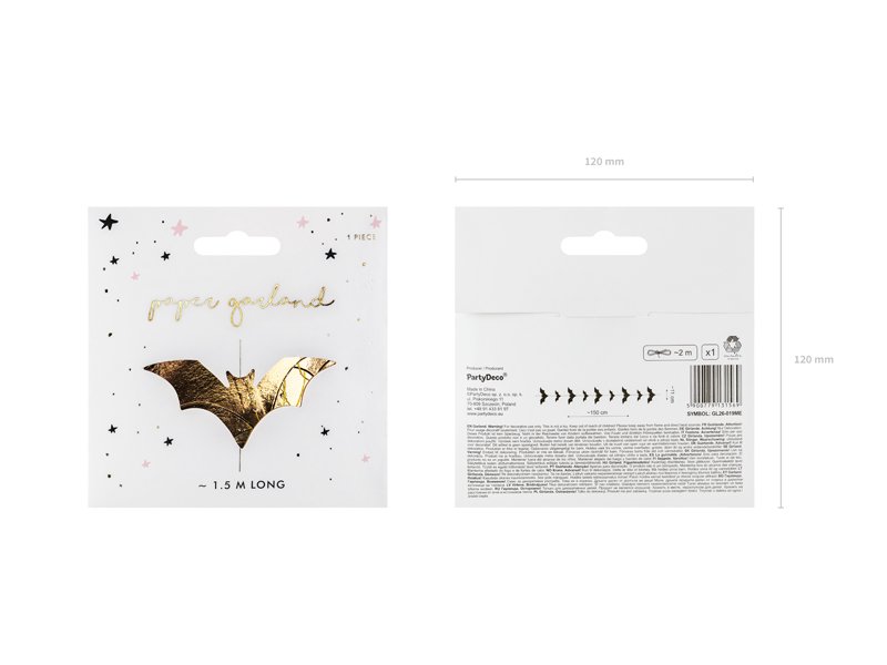 Šitá girlanda Netopýři zlaté metalické barvy, z papíru, délka cca. 1,5 m, šířka cca. 11 cm.