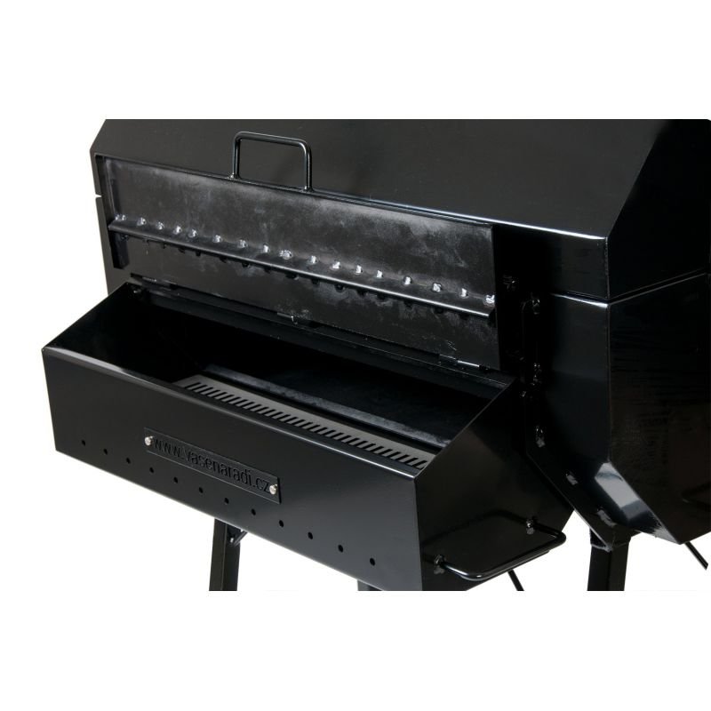 Tělo grilu G45, boční topeniště, jehlu a bodce + nerezový rošt pro nepřímé grilování, uzení klobás, motorek UMR03 se síťovým adaptérem.