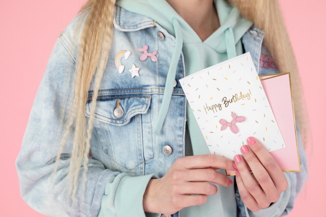 Blahopřání Happy Birthday se smalt odznakem Balónkový pes + obálka se zlatým lemem (zn. PartyDeco)