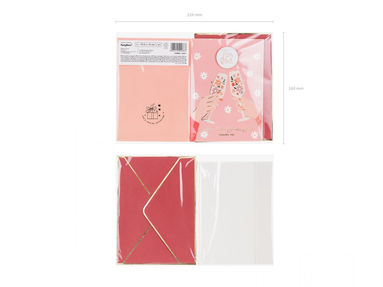 Karta mix barev se zlatým metalickým potiskem se smaltovaným odznakem s nápisem Team Bride a obálkou v růžové barvě se zlatým metalickým potiskem, velikost karty cca. 10,5 x 15 cm, velikost smaltovaného kolíku cca. 3,5 x 3,5 cm.