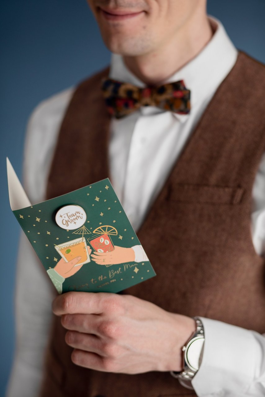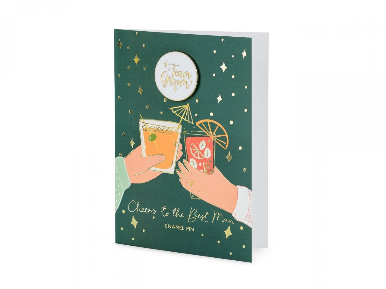 Karta mix barev se zlatým metalickým potiskem se smaltovaným špendlíkem s nápisem Team Groom a obálkou v červené barvě se zlatým metalickým potiskem, velikost karty cca. 10,5 x 15 cm, velikost smaltovaného kolíku cca. 3,5 x 3,5 cm.