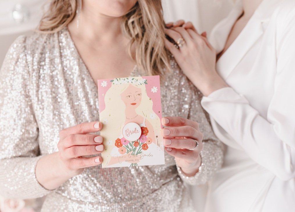 Karta mix barev se zlatým metalickým potiskem se smaltovaným špendlíkem s nápisem Bride a obálka v bílé barvě se zlatým metalickým potiskem, velikost karty cca. 10,5 x 15 cm, velikost smaltovaného kolíku cca. 3,5 x 3,5 cm.
