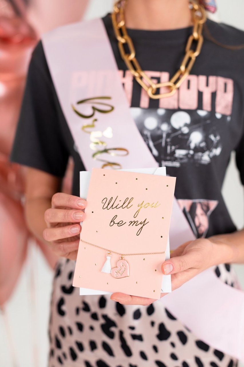 Krabička na oslavu nevěsty, mix barev, sada obsahuje: šerpu (1 ks), kartičku s náramkem (1 ks), fóliový balónek (1 ks), latexové balónky (růžové zlato, 6 ks) a konfety (15 g).