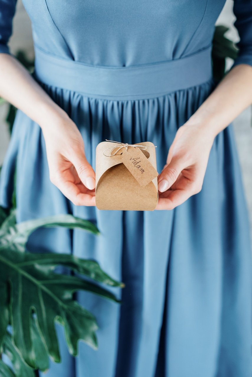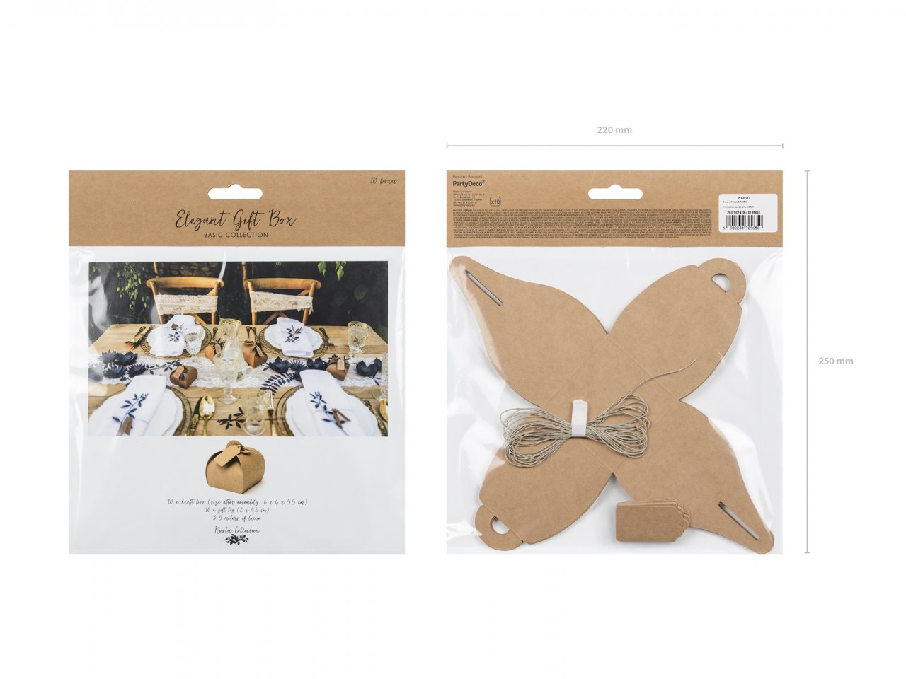 Krabičky s visačkami, vyrobené z kraftového papíru, sada obsahuje 10 krabic (velikost po složení cca 6 x 6 x 5,5 cm), 10 visaček (velikost cca 2 x 4,5 cm) a cca. 3,5 m provázku.