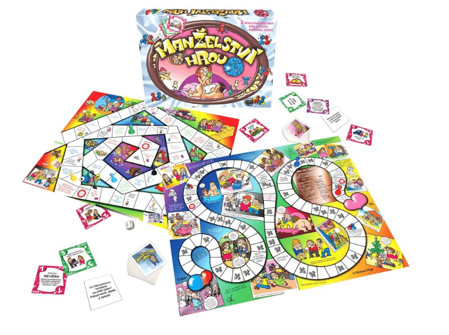 Není lepšího svatebního dárku, než je tato zábavná hra pro novomanžele. Manželství hrou je společenská hra, která zpestří každé manželství. Hra funguje na principu manželského bodového systému, kdy se hodnotí soužití a prohřešky manželů. Jakmile dosáhnete 12ti bodů bude následovat sankce. Vítězem se stává ten, kdo jako první dorazí s figurkou do cíle. Okořeňte si manželství a užijte si spoustu legrace s touto báječnou hrou, která Vám připraví spoustu nečekaných zvratů. Originální dárek pro novomanžele.
