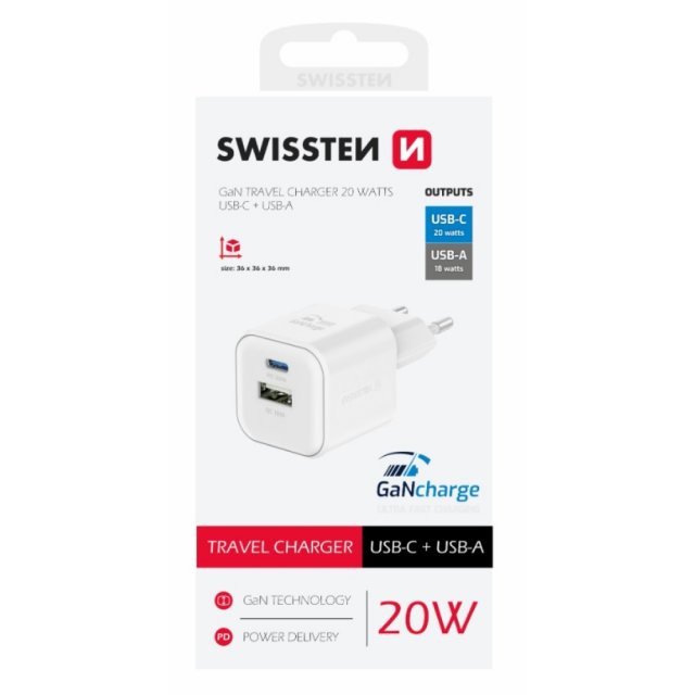 Mini adaptér GaN, 20W, power delivery, 1xUSB-C + 1xUSB QuickCharge 18W, bílá (zn. SWISSTEN)