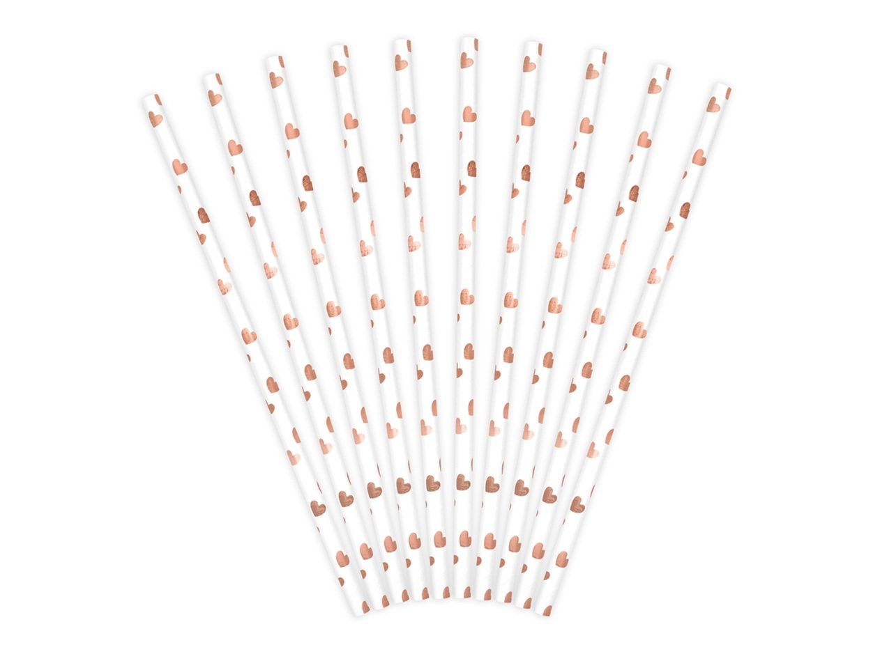 Papírová brčka, bílá s metalickými srdíčky světle růžového zlata, délka cca. 19,5 cm.