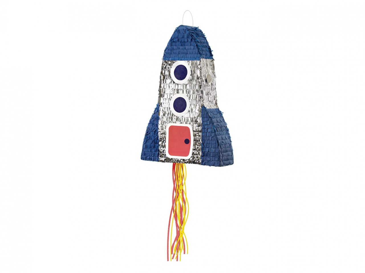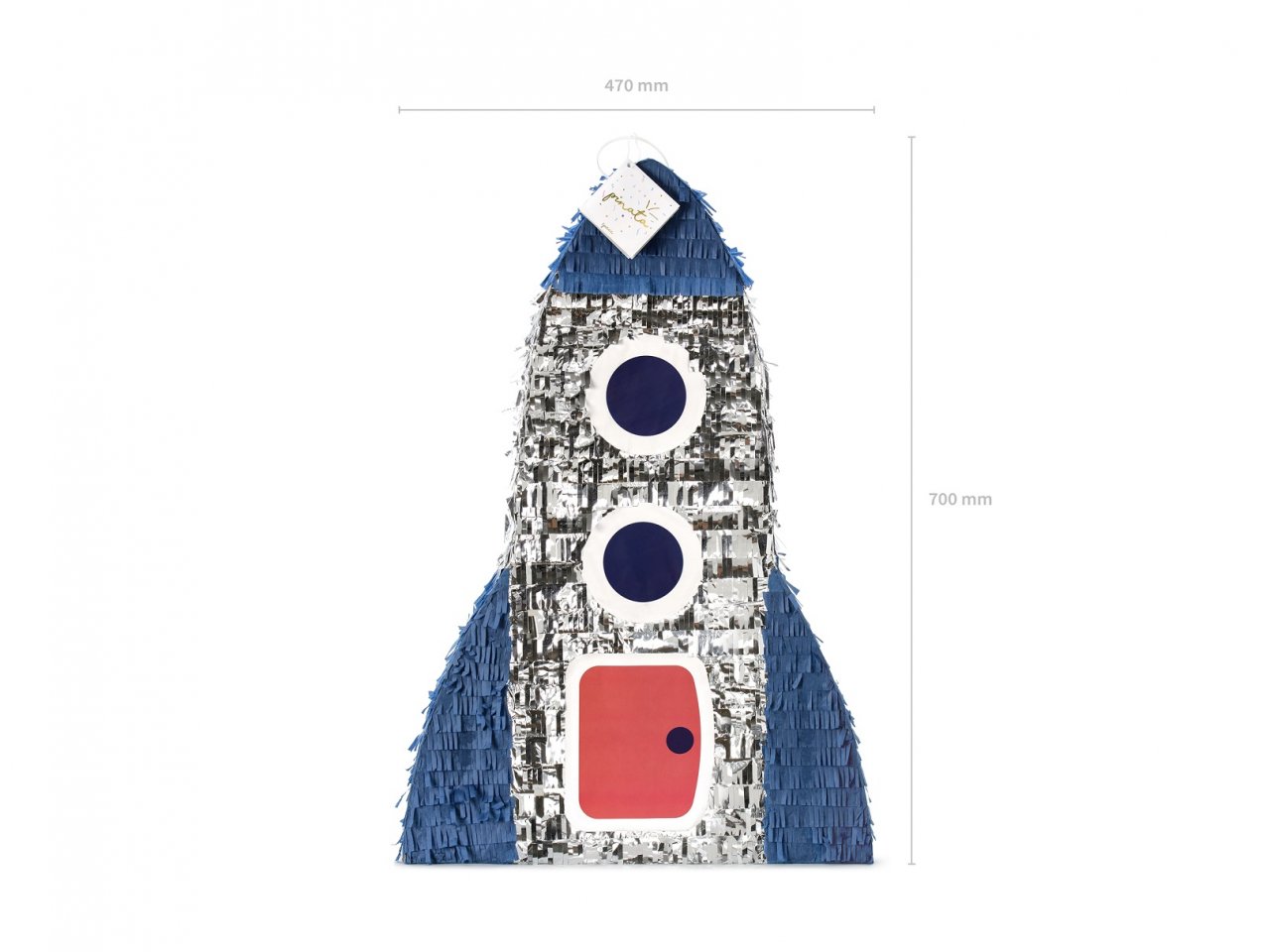 Piňata ve tvaru rakety, mix barev, k plnění dobrotami, velikost cca. 45,5 x 69,5 x 14 cm.