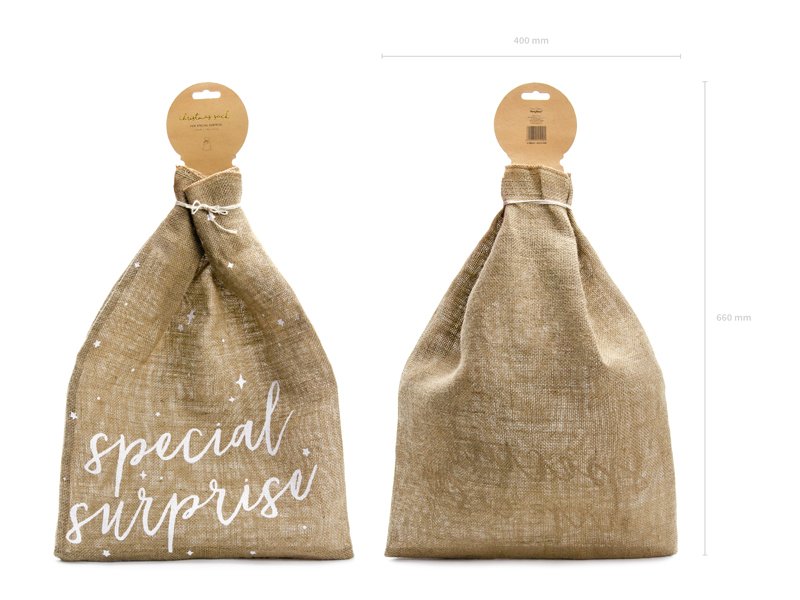 Jutová taška s bílým potiskem a nápisem Special Surprise, sada obsahuje tašku a cca 1 m jutového provázku, rozměry cca 40 x 55 cm.