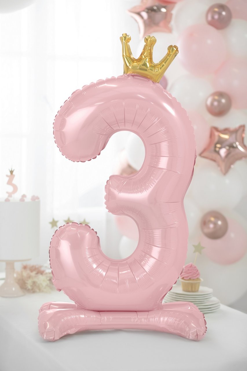 Stojací balonek z metalické fólie Číslo ''3'' ve světle růžové barvě s korunkou ve zlaté barvě, velikost před nafouknutím cca. 103 cm (40,5''), velikost po nafouknutí 84 cm (33''). Nafoukněte vzduchem.
