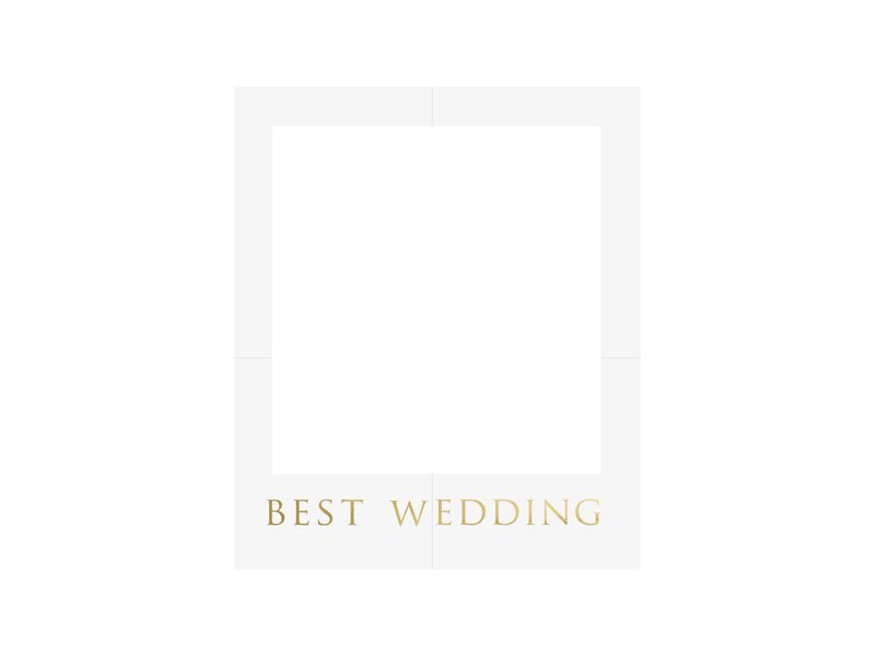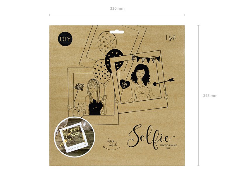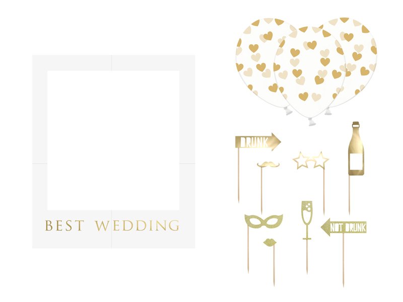 Sada se selfie rámem, sada obsahuje: bílý rám se zlatým nápisem Best Wedding (rozměry po složení cca 50 x 59,5 cm, 1 ks), Gadgets na fotografie ve zlaté barvě (výška po složení cca 21 - 42 cm , 8 ks), Průhledné balónky se zlatými srdíčky (velikost cca 30 cm, 3 ks) a cca 3 m zlatého provázku.