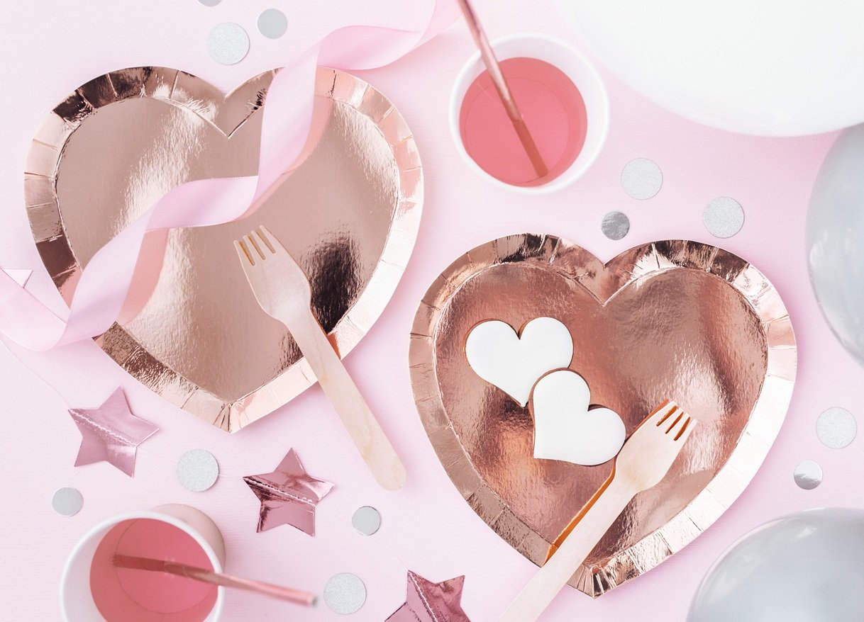 Lesklé papírové talíře ve tvaru srdce v barvě růžového zlata o velikosti capprox. 21 x 19 cm