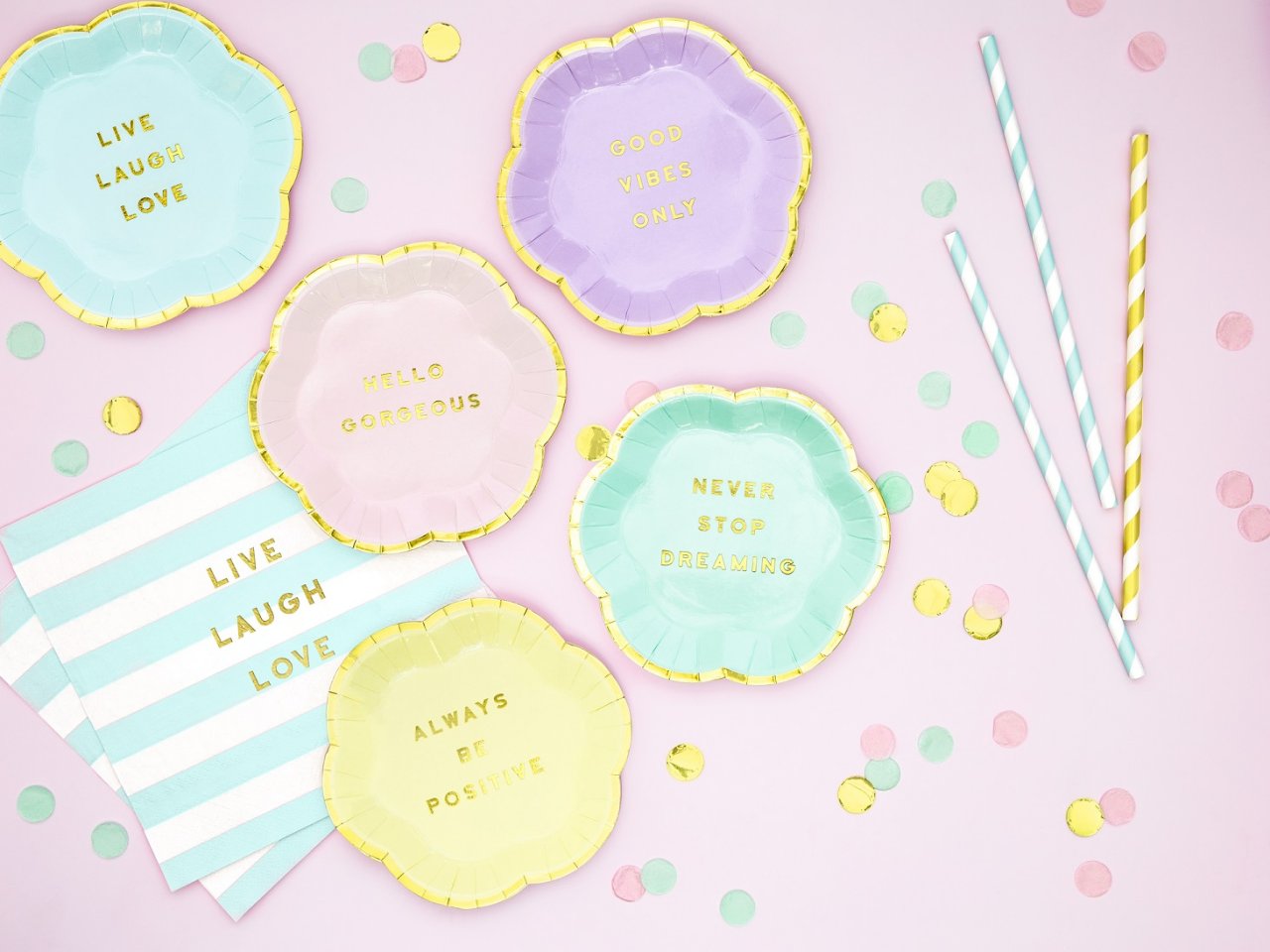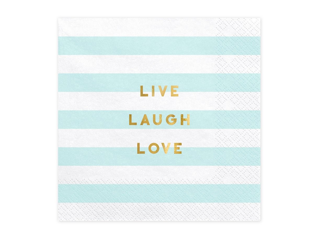 Papírové ubrousky Yummy, mix barev (bílá a světle modrá) se zlatým nápisem Live Laugh Love, velikost po rozložení cca. 33 x 33 cm, rozměr po sestavení cca. 16,5 x 16,5 cm.